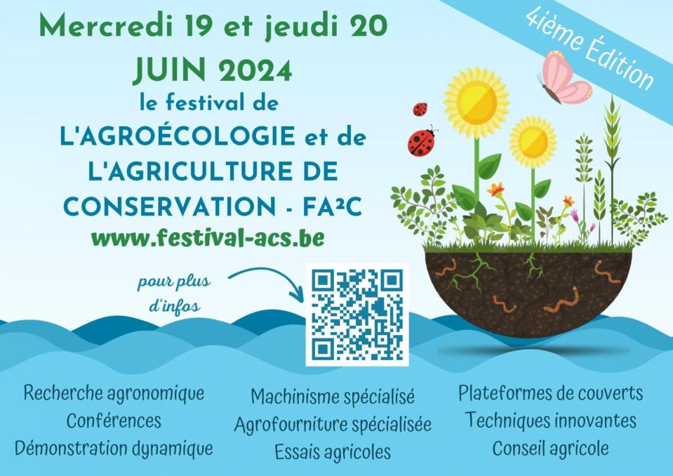 Greenotec et le SPW réitèrent la 4ième édition du Festival de l’Agroécologie et de l’Agriculture de Conservation des sols (FA²C 24). Celui-ci se déroulera sur 2 jours, les mercredi 19 et jeudi 20 juin 2024, dans le très beau cadre de la Ferme de Freloux à Fexhe-le-Haut-Clocher près de Liège.