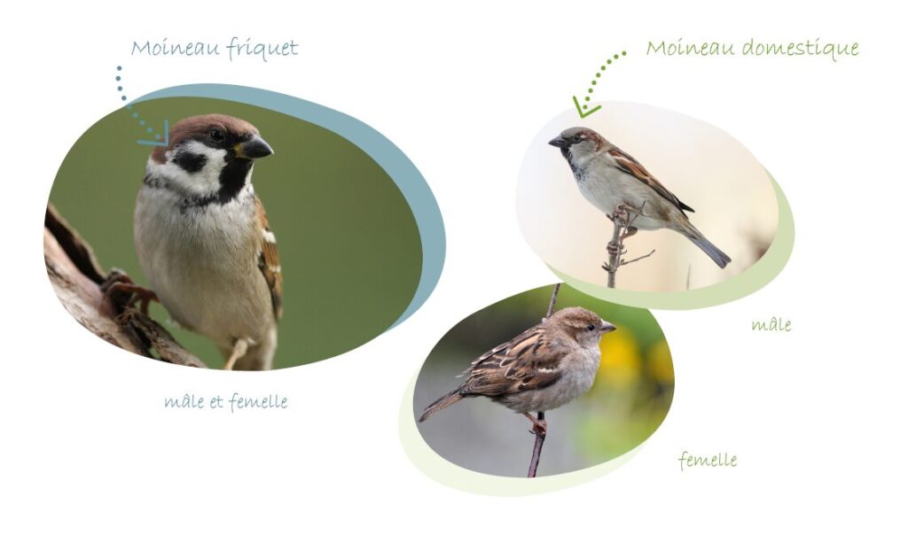 Il existe deux espèces de moineaux dans nos campagnes. Ils se ressemblent. Le moineau friquet se distingue facilement du moineau domestique par une tache noire sur fond blanc de la joue et une tête brune sur le dessus. Le mâle et la femelle sont identiques. Contrairement à son cousin domestique, le moineau friquet se rencontre exclusivement en milieu rural. Il niche surtout dans les vieux bâtiments (dont certaines fermes et vieux abris à bétail) et dans les cavités d’arbre (notamment dans les vergers).