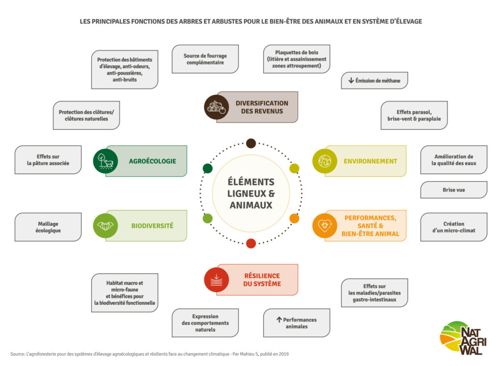 Le schéma ci-dessous présente la multitude de fonctions jouées par les ligneux sur le bien-être des animaux et en système d’élevage. Nous vous proposons un accompagnement sur mesure et gratuit de vos projets de plantations dans le cadre du bien-être des animaux afin que les ligneux implantés rencontrent vos attentes.