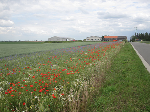 La parcelle est ensemencée d’un mélange de céréales et de fleurs des champs (ou plantes messicoles) à forte valeur paysagère ou patrimoniale telles que le grand coquelicot, le bleuet ou le chrysanthème des moissons. Il existe également une MAEC spécifique appelée « bande de conservation des plantes messicoles », destinée à les conserver là où ces espèces sont encore présentes. Cette variante consiste en des parcelles de céréales non pulvérisées.