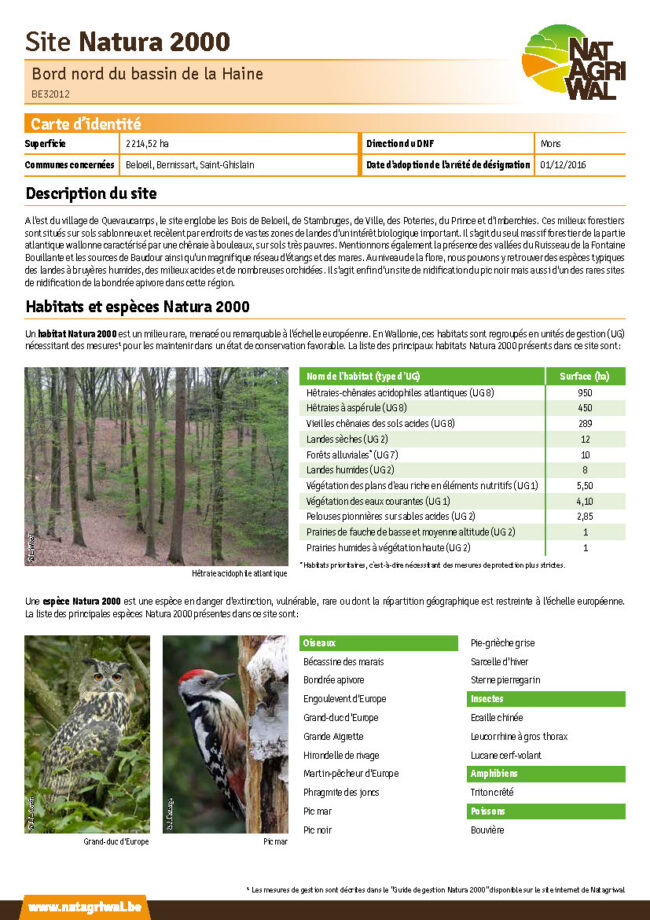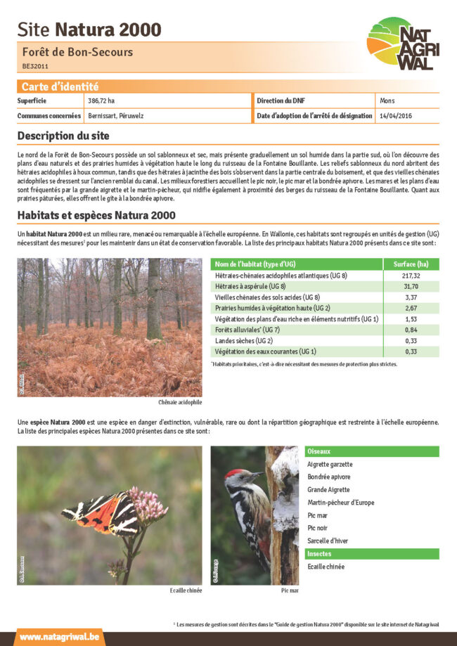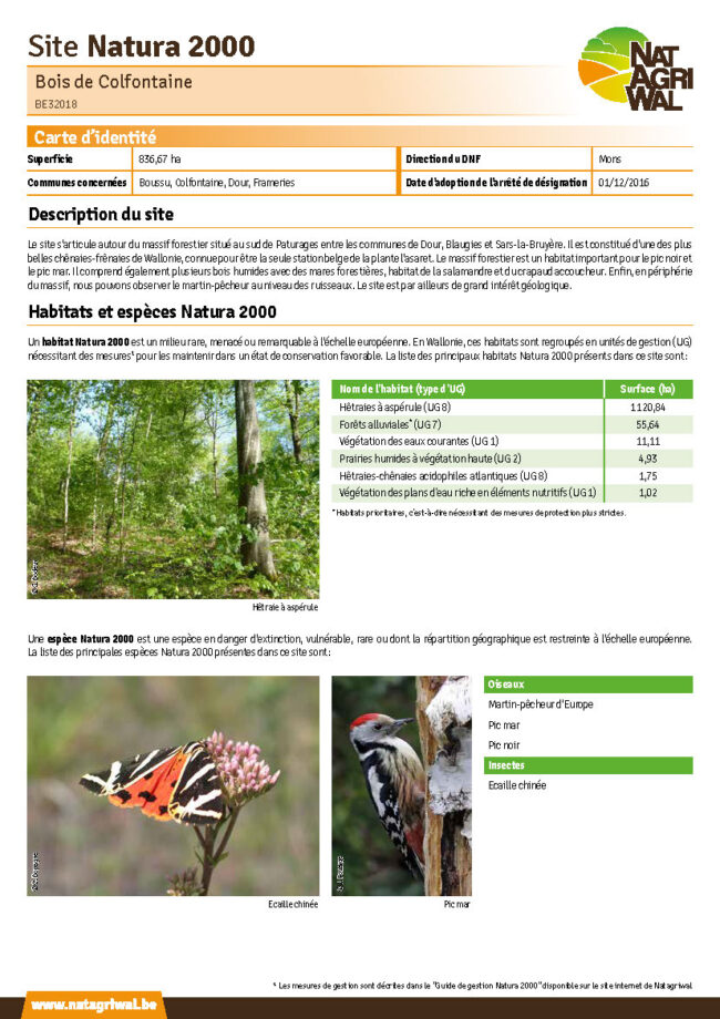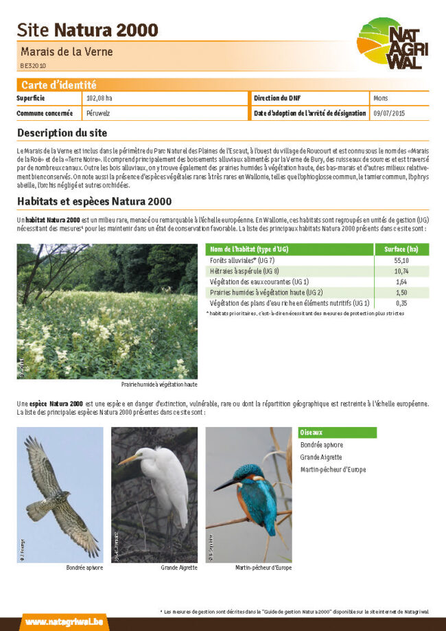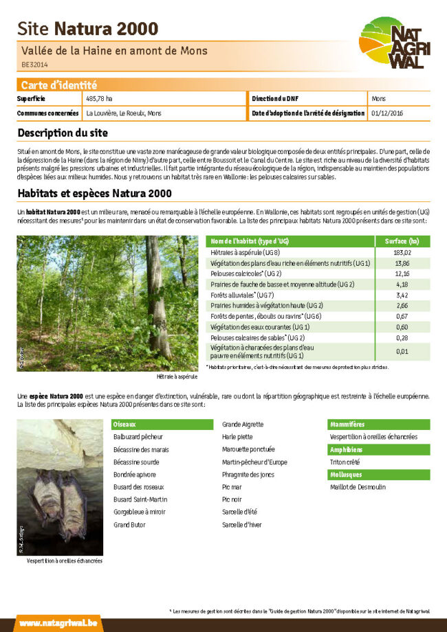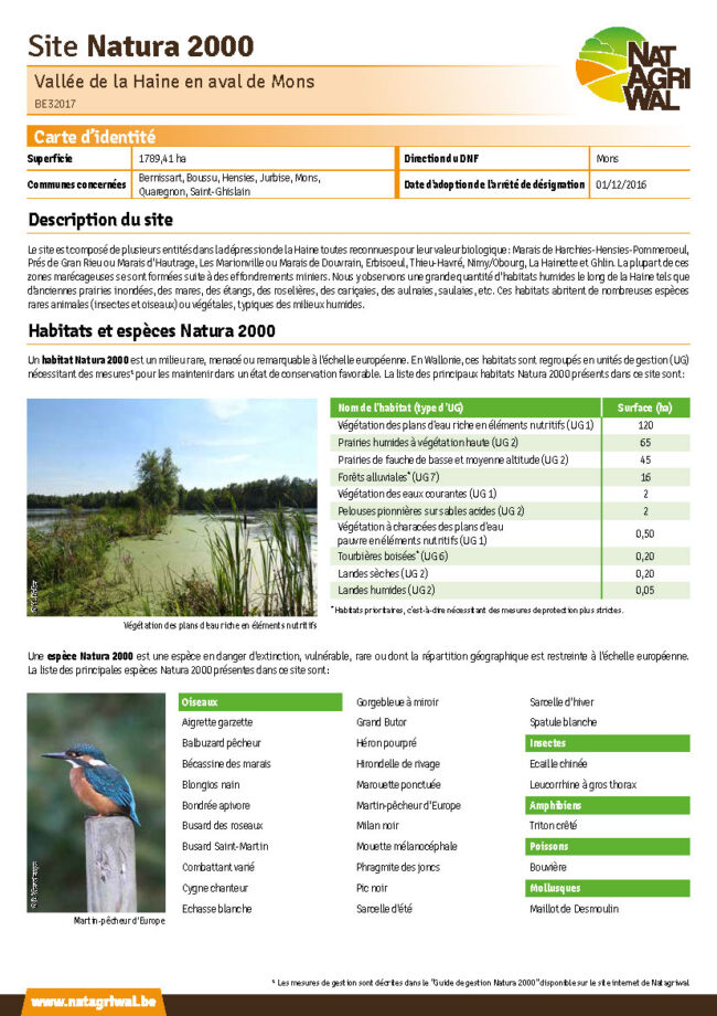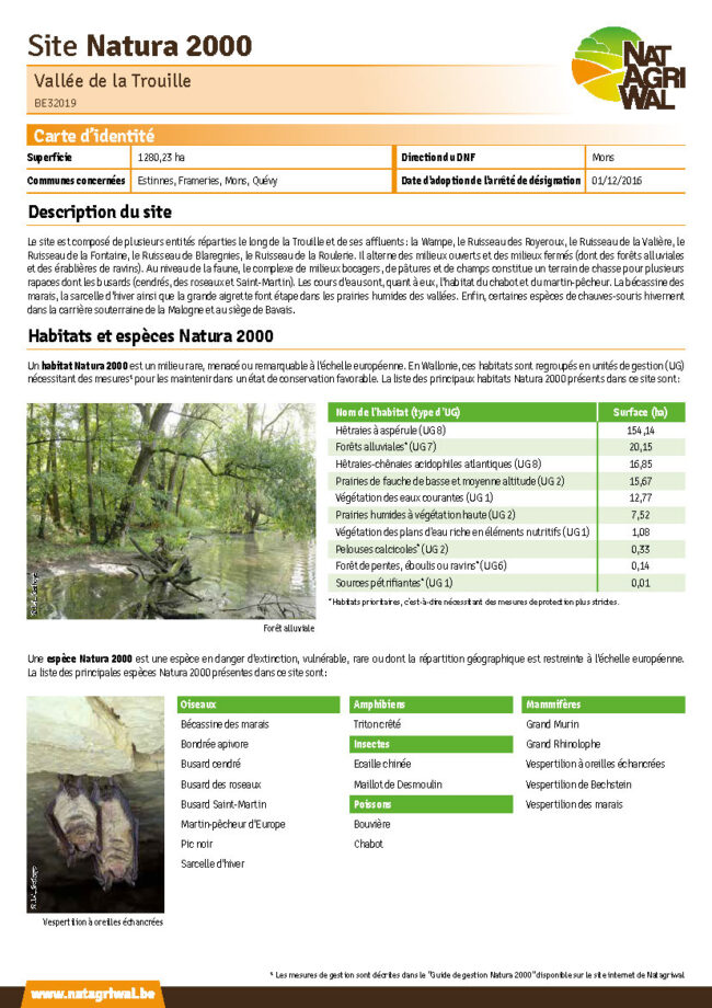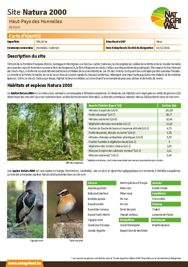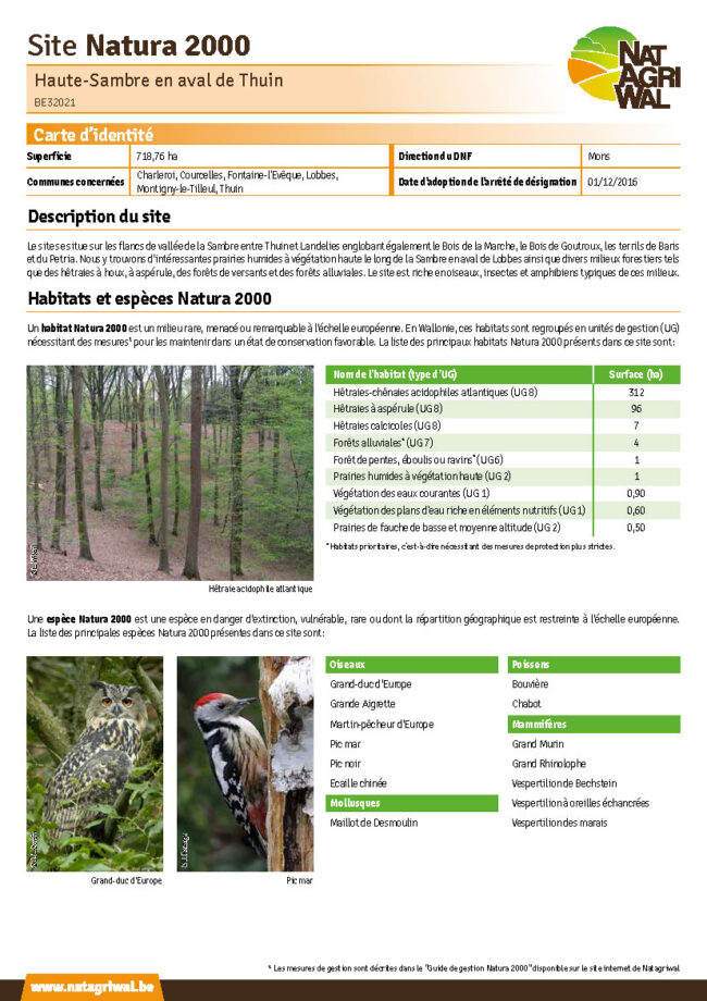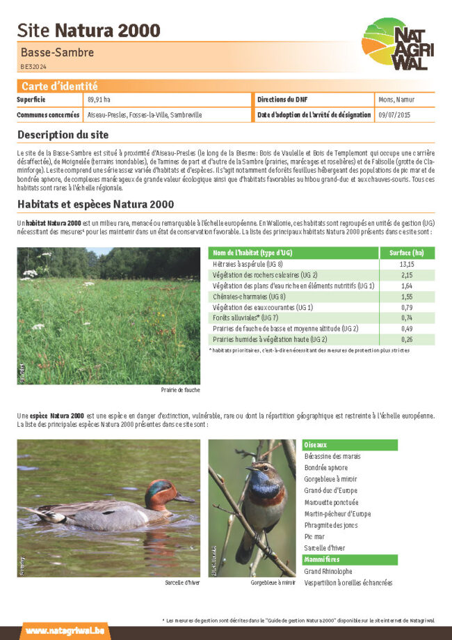 En Wallonie, le réseau Natura 2000 compte 240 sites identifiables par un nom et un code spécifique. Ils sont officiellement désignés comme aire protégée par un arrêté de désignation. Chacun des sites est caractérisé par des unités de gestion où se trouvent les habitats et les espèces d’intérêt communautaire.