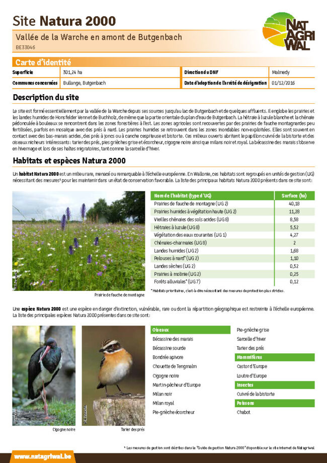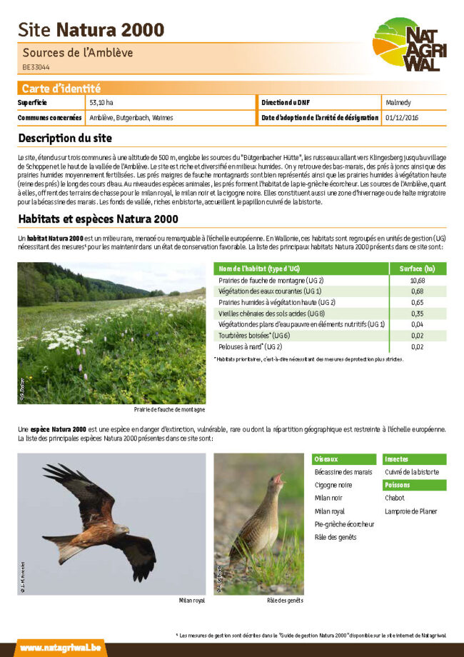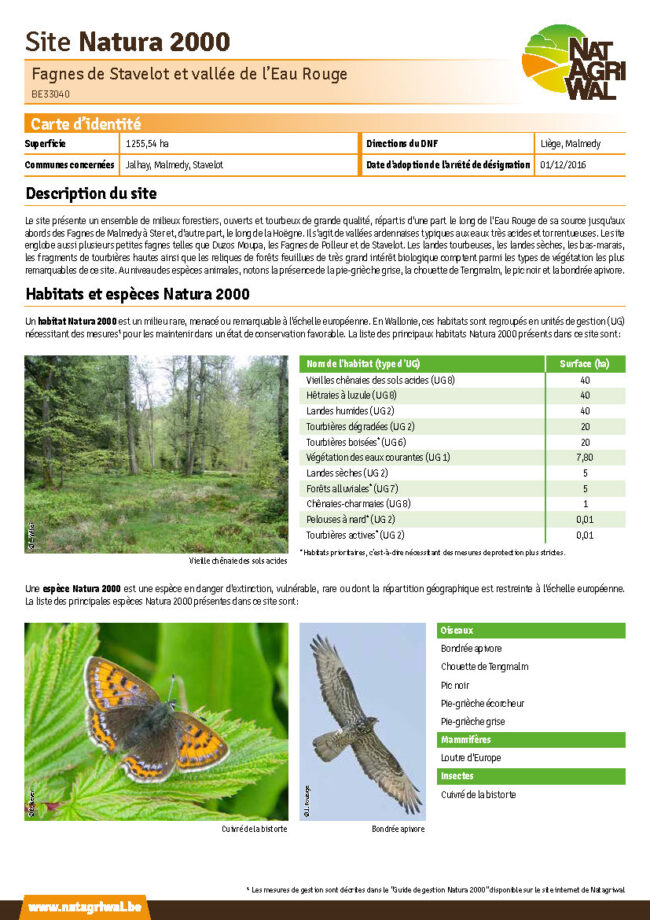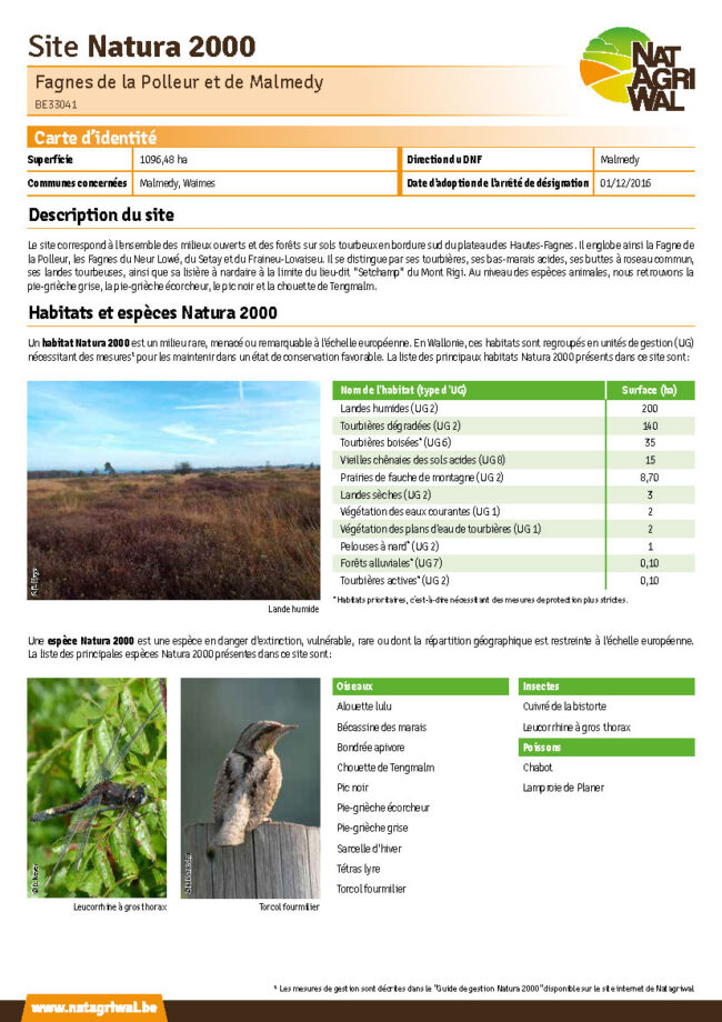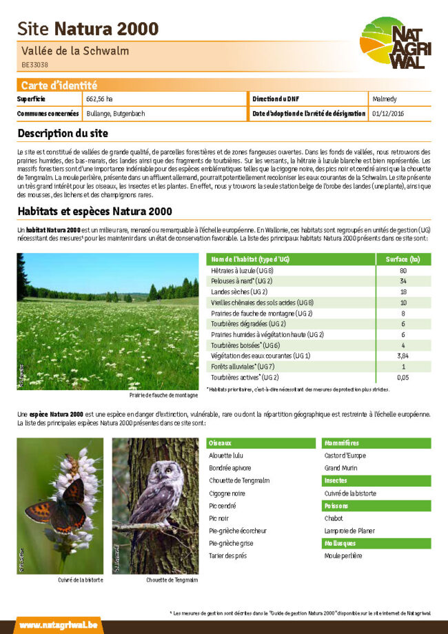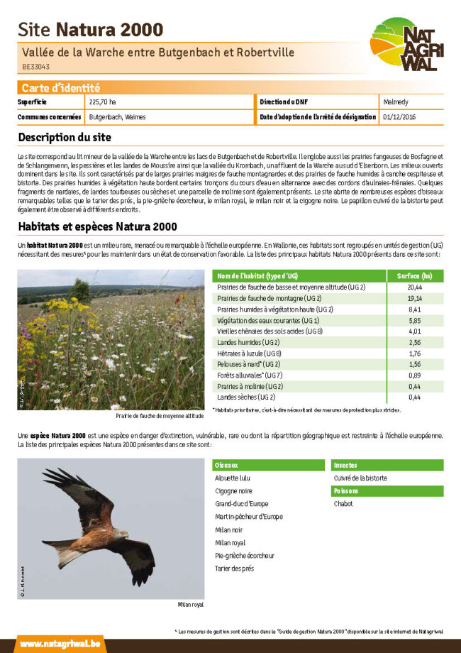 En Wallonie, le réseau Natura 2000 compte 240 sites identifiables par un nom et un code spécifique. Ils sont officiellement désignés comme aire protégée par un arrêté de désignation. Chacun des sites est caractérisé par des unités de gestion où se trouvent les habitats et les espèces d’intérêt communautaire.