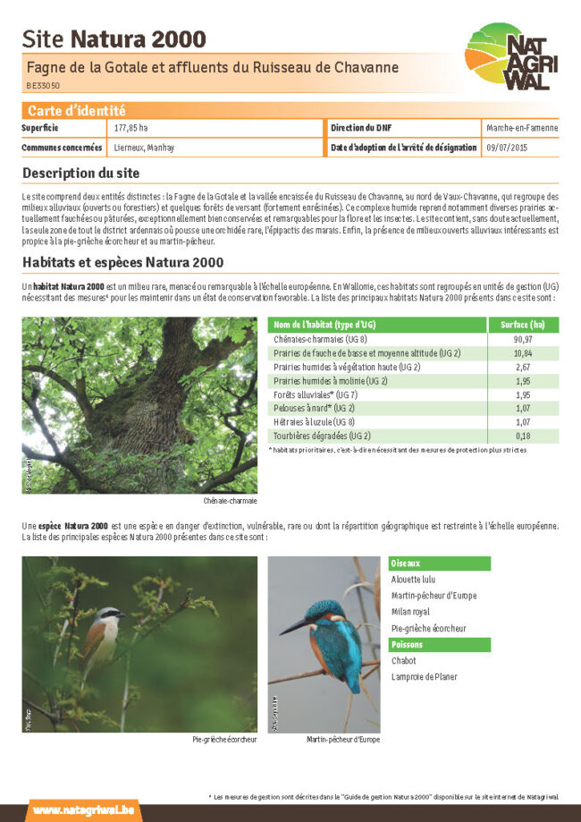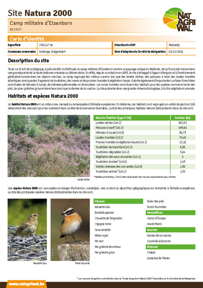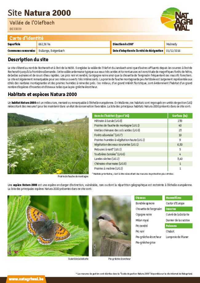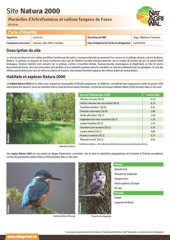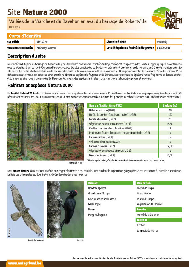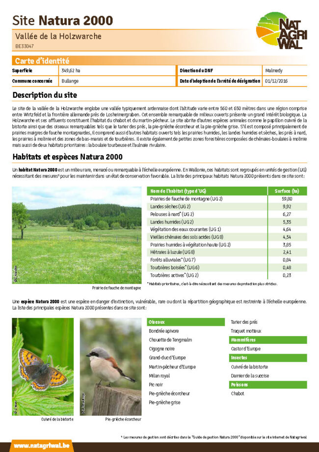 En Wallonie, le réseau Natura 2000 compte 240 sites identifiables par un nom et un code spécifique. Ils sont officiellement désignés comme aire protégée par un arrêté de désignation. Chacun des sites est caractérisé par des unités de gestion où se trouvent les habitats et les espèces d’intérêt communautaire.