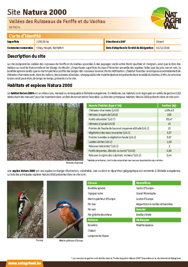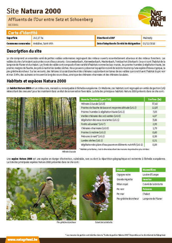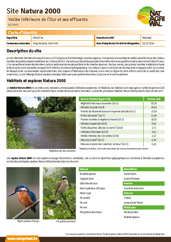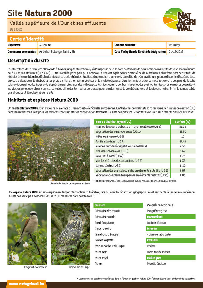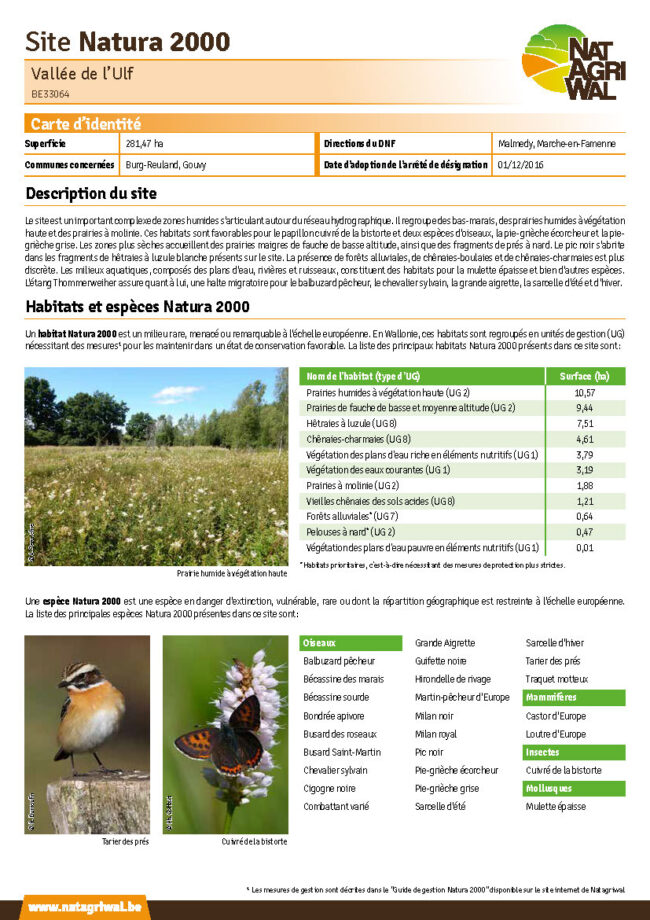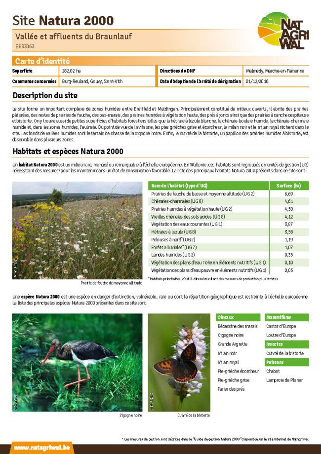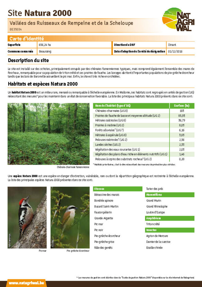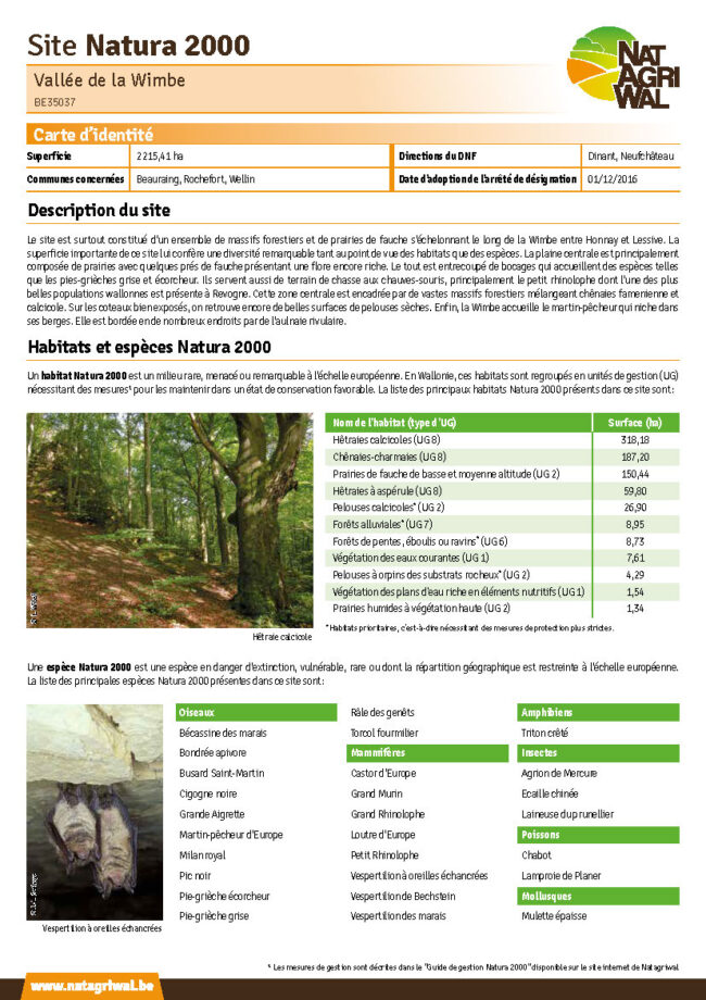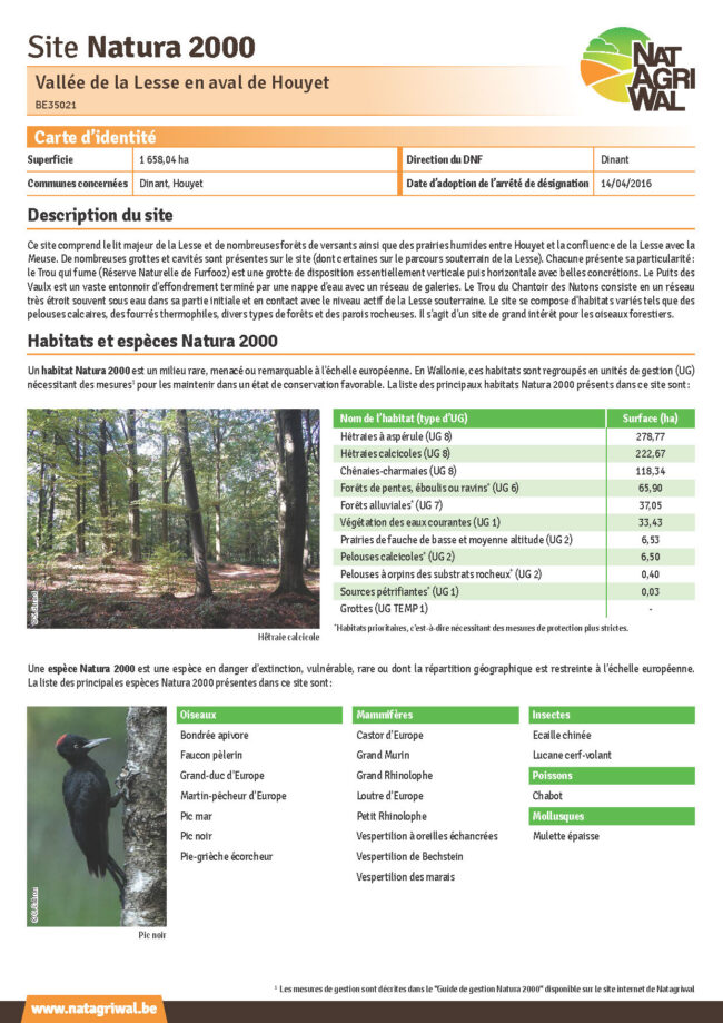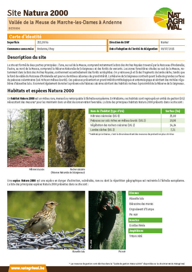 En Wallonie, le réseau Natura 2000 compte 240 sites identifiables par un nom et un code spécifique. Ils sont officiellement désignés comme aire protégée par un arrêté de désignation. Chacun des sites est caractérisé par des unités de gestion où se trouvent les habitats et les espèces d’intérêt communautaire.
